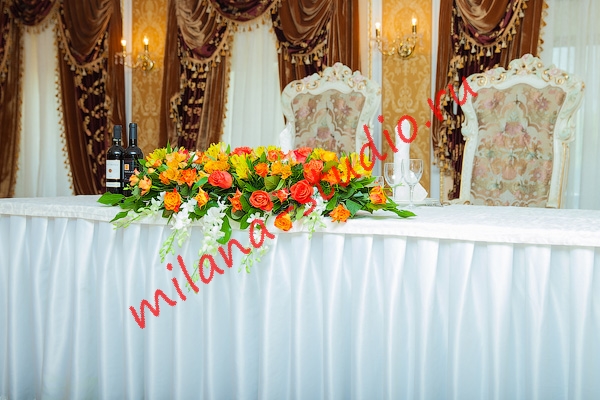 При оформлении свадебного зала в ресторане Парадайз наней студией была использована цветовая гамма оранжевого цвета. Цвет солнца излучал энергию, тепло и радость.