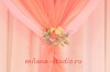 Украшение свадебного зала ресторана Европейский было выполнено в нежных персиковых тонах. Роскошный президиум драпирован белой и персиковой вуалью и украшен живыми цветами.
