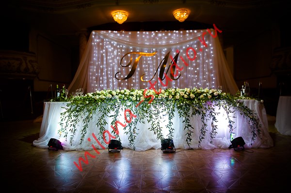 Оформление зала на свадьбу в ресторане Суриков Холл было выполнено в классической белой цветовой гамме. На роскошном президиуме красовались золотые инициалы молодоженов. Стол украшала огромная флористическая композиция, составленная из белых роз и орхидей с ниспадающей зеленью. Благодаря заливной подсветке стол молодоженов на протяжении всего вечера озарялся всеми цветами радуги. Интерьер роскошного ресторана Суриков Холл был профессионально оформлен нашими декораторами.