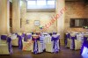Очень эффектным и необычным выглядело оформление зала на свадьбу в стиле гжель. Драпировка стола молодоженов в бело-синей цветовой гамме с подсветкой. На стульях синие банты с ниспадающими вниз струящимися белыми лентами. На столах скатерти в бело-синей цветовой гамме с рисунком гжель. Флористические композиции на столах гостей и молодых были составлены из кремовых роз, сиреневой орхидеи, эустомы, зелени. Фужеры молодоженов, шампанское украшены белой и синей лентой. Также как и сундучок для денег.