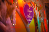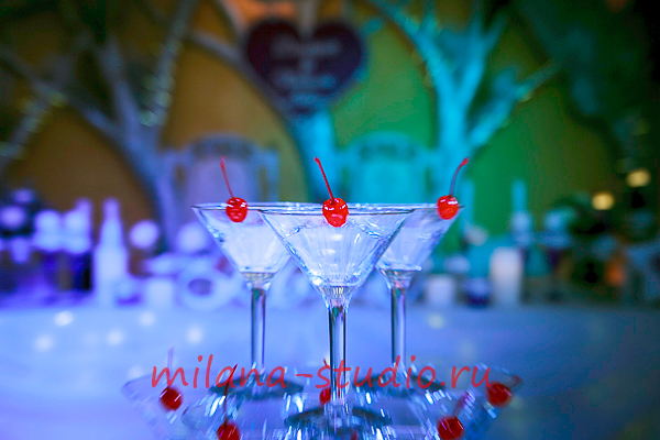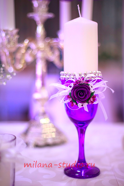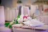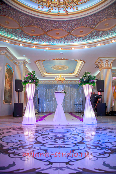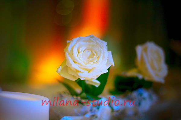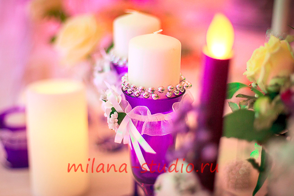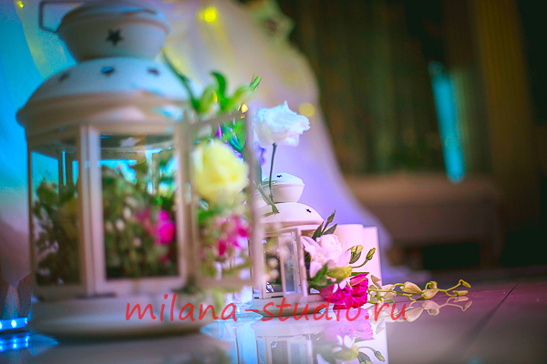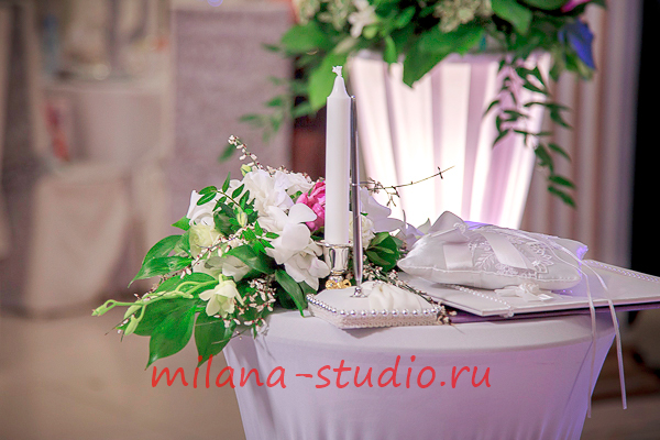 Камин украшен флористической композицией из розовых, кремовых роз, орхидей, зелени, гипсофилы. На столах гостей флористические композиции из тех же цветов. Внутрь вазы помещена веточка белой орхидеи. Номера столов- в золотом цвете на подставке. На столе молодоженов свечи различного размера и формы в подсвечниках, украшенных лентами и бусинками. Флористическая композиция из роз, орхидей, зелени. Фужеры для шампанского украшены букетом из кремовой розы и фиолетовой орхидеи.