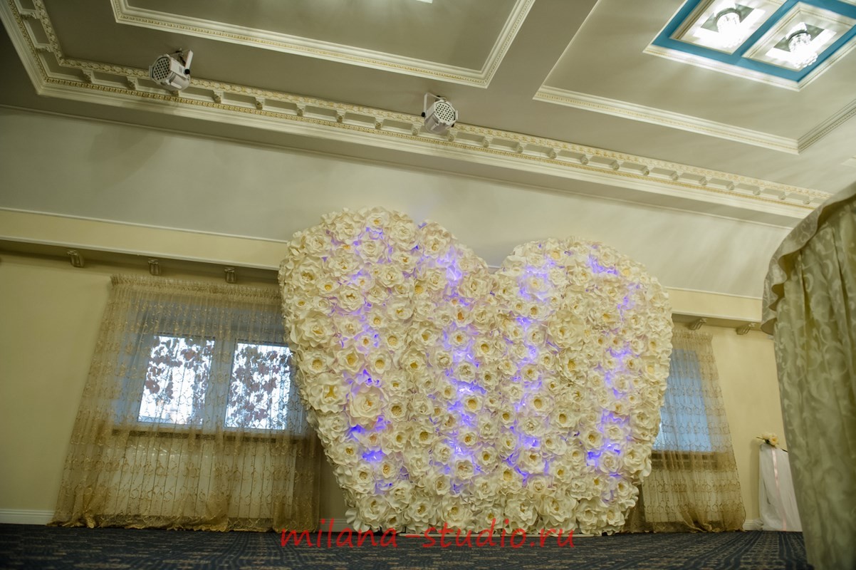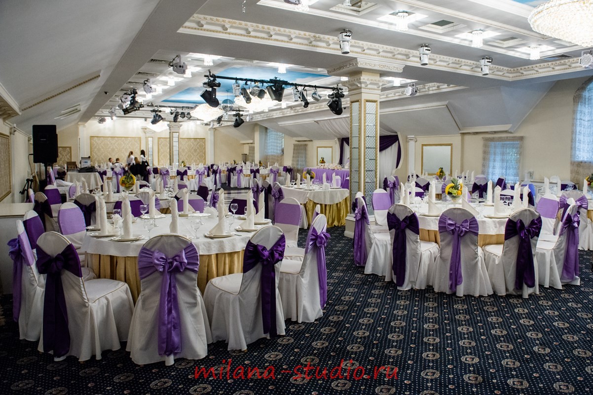 Украшение свадебного зала ресторана Усадьба было роскошным и необычным. Фон за столом молодых драпирован фиолетовым атласом и белым шифоном. Стол оформлен сиреневым атласом. На нем флористическая композиция из декоративных пионов розового, кремового, белого, желтого цветов. На белоснежных чехлах стульев чередовались атласные банты сиреневого и фиолетового цвета. Перила, ведущие в зал были драпированы белой вуалью, украшены атласными лентами и букетами из пионов. Всех поднявшихся по лестнице поразило панно, из белых роз, составленное в форме сердца. Оформление зала на свадьбу в ресторане Усадьба, выполненное в сочетании сиреневого и фиолетового цветов, символизирующих светлое будущее, гармонию с окружающим миром, сделало его интерьер незабываемым и праздничным.