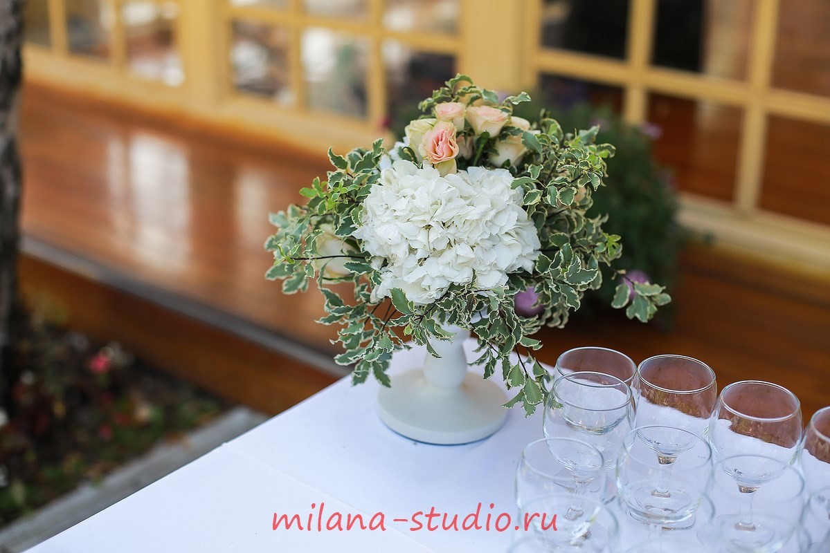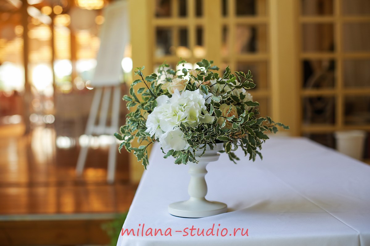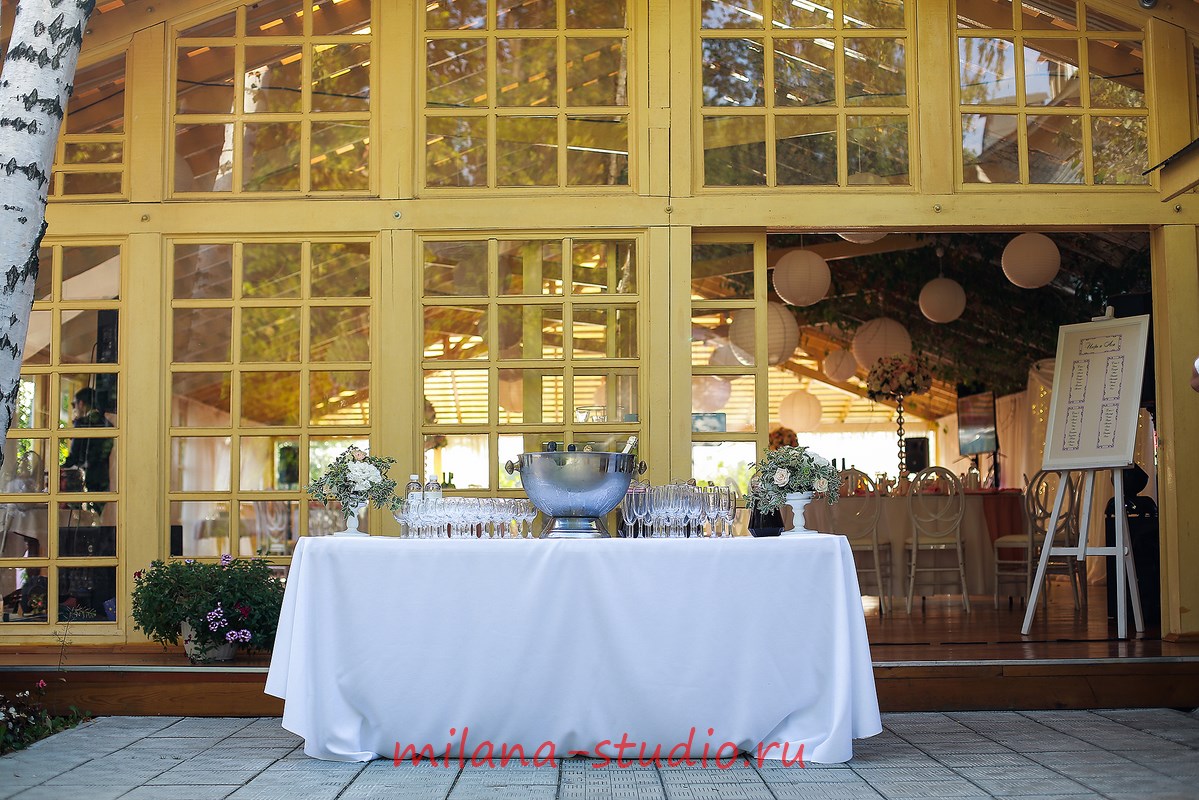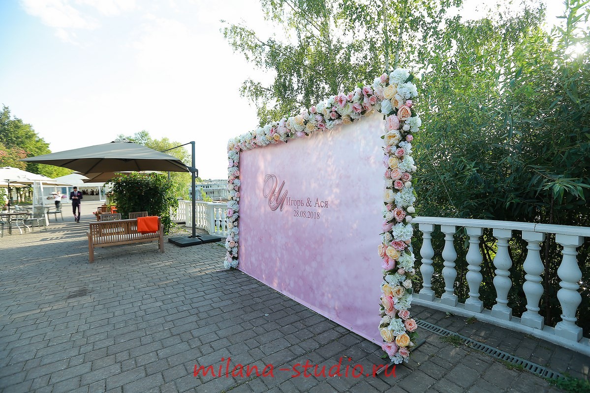 Оформление зала на свадьбу в яхт-клубе Аврора было выполнено в бело розовых тонах. Фон за столом молодых драпирован белой вуалью. На нем роскошная флористическая композиция, составленная из орхидей, розовых и белых пионов, роз. На фоне и столе была установлена подсветка. На столах гостей флористические композиции, составленные из пионов, роз, зелени в вазе на высокой ножке. Атласные розовые дорожки и нежно розовые салфетки. Карточки рассадки с розовым орнаментом. Бонбоньерки розового цвета были украшены цветами и атласными бантами. Номера столов в белой резной рамочке. У входа в ресторан располагался баннер розового цвета с именами молодых и датой свадьбы, украшенный по периметру флористической композицией из пионов, роз, зелени. Схема рассадки была выполнена в белых тонах. Украшение свадебного зала в яхт-клубе Аврора в сочетании белого и розового тонов выглядело трогательно нежно и романтично.