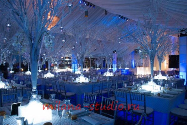 Новогоднее оформление банкетного зала может быть выдержано в таких тематических направлениях:
