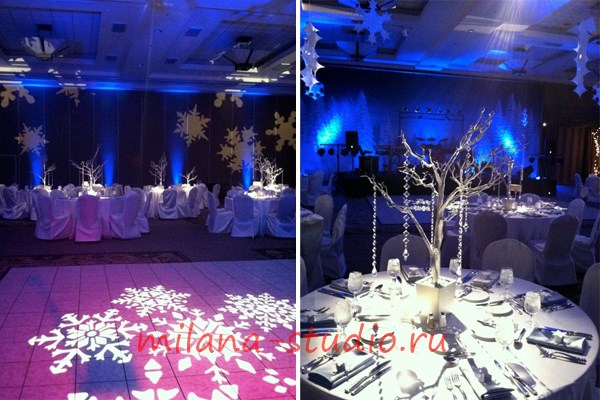 Оформление новогоднего корпоратива или зимней свадьбы должно учитывать простые правила. Например, фонарики стоит вешать над сценой, а не над столами, дабы излишний свет не мешал посетителям. Временные аппликации стоит использовать для украшения матового пола - они визуально увеличат пространство, а вот от оформления иллюминацией пола, имеющего зеркальную поверхность, лучше отказаться. В оформлении новогоднего стола стоит сделать акцент на украшенной вышивкой скатерти, декорированных свечах, фонариках, салфетках и вазах. Помните о том, что новогодняя стилистика должна присутствовать в каждой детали.