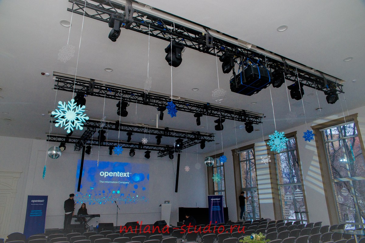 Также в нашу задачу входила закупка необходимых материалов, монтаж декора, высотные работы по монтажу снежинок.
